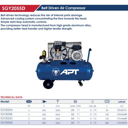 الطاقة المقدرة : 4000 واتالتيار الكهربائي عند الجهد : 380 فولت 8.3 أمبيرالسرعة المقدرة : 980 دقيقةسعة خزان الهواء : 200 لترضغط العمل : 8 بارالإنتاجية : 480 لتر / دقيقةالوزن : 134 كجم