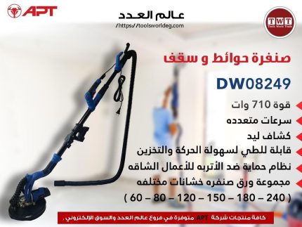 ماكينه صنفره سقف + حائط مفصلي 10 بوصة 710 وات APT DW08249 - قوة 710 وات - سرعات متعددة - كشاف ليد - قابلة للطي لسهولة الحركة و التخزين - نظام حماية ضد الأتربة للأعمال الشاقة - مجموعة ورق صنفرة خشانات مختلفة (60-80-120-150-180-240) - طقم شربون
