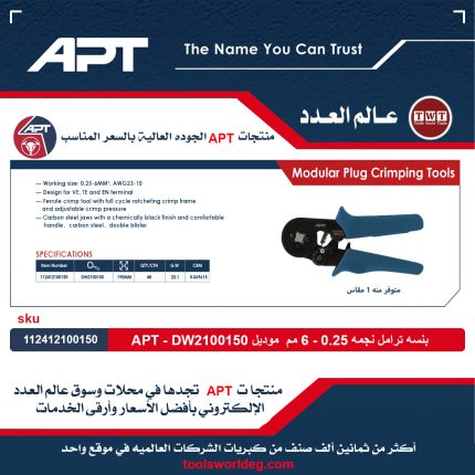 المواصفات الأساسية الموديل: DW2100150. نطاق الكبس: من 0.25 مم² إلى 6 مم² (أي تقريباً AWG23-10) لمقاسات الترامل. الطول/الحجم تقريباً: 190