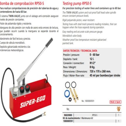 ماكينة اختبار مواسير اسباني 60 بار تانك 12 لتر سوبر ايجو موديل SUPER-EGO R6020000