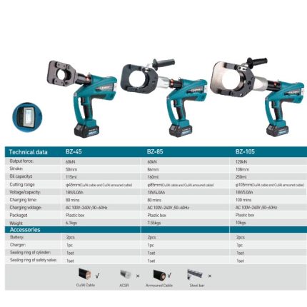 ما هي BZ‑85؟ BZ‑85 هي أداة تعمل بالبطارية (Li‑ion غالبًا) تستخدم لقطع أو تجعيد الكابلات الكهربائية (Cu / Al) أو