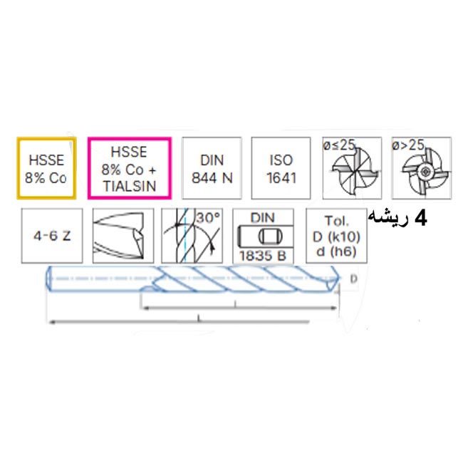 • “4-ريشة (4 Flute)” يعني أن الأداة تحتوي أربع حواف قطع (فلوتات) لولبية موزّعة حول المحور. هذا يعطي ثبات أعلى وقوة أكبر مقارنة بأدوات بعدد فلوت أقل.
