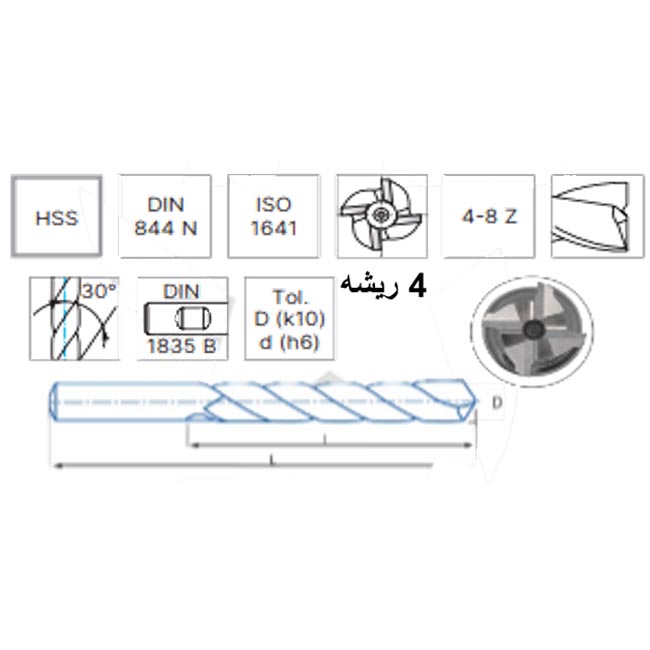 | شكل الرأس | سن / طرف حفر | ريش/شفرة (4 فلوت) تدور وتقص المعدن |