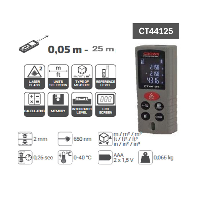 متر ليزر كراون 25 متر ديجيتال موديل CROWN CT44125