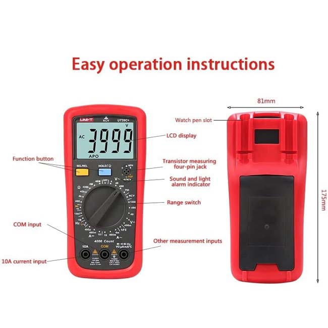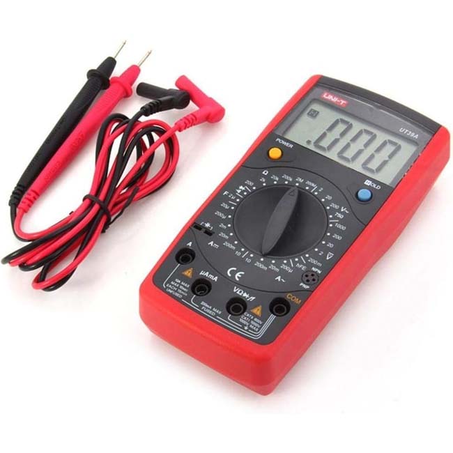 يُستخدم لقياس عدة كميات كهربائية في الدوائر مثل الجهد (AC / DC)، التيار (AC / DC)، المقاومة، السعة، اختبار الصمام الثنائي، الاستمرارية، ومعامل التضخيم للترانزستور (hFE).