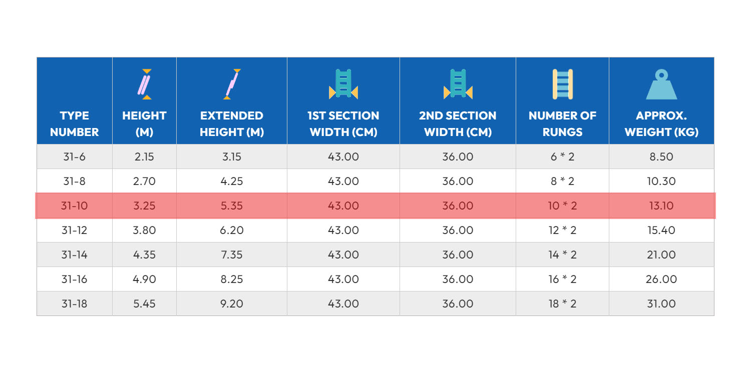 سلم الومنيوم ميتافورم طراز 31 وصلتين منزلقين 10 درجة طولية الطول 3.25م – 20 درجة ممتدة الطول 5.35م METAFORM
