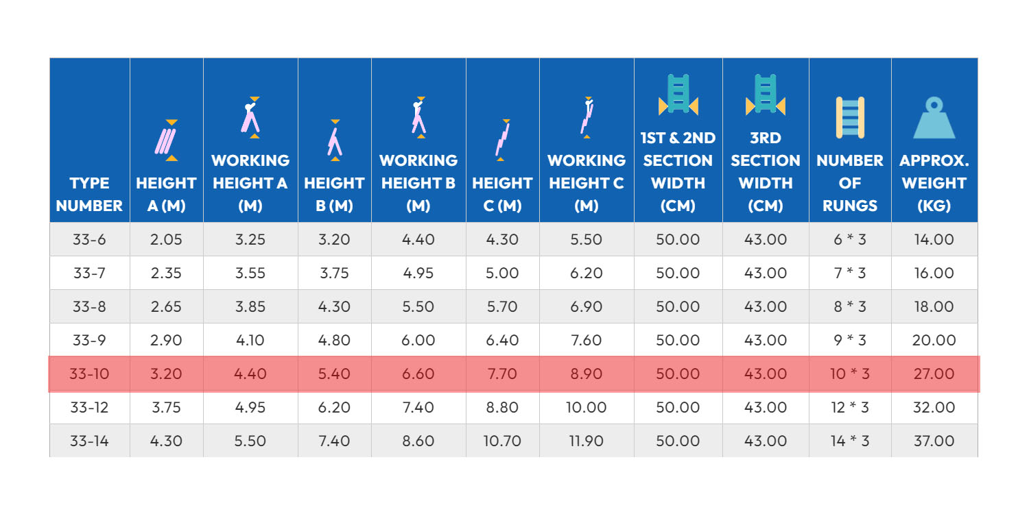 سلم الومنيوم ميتافورم طراز 33 ثلاث وصلات منزلق متعدد الاستخدام(10 درجة طول 3.20م – 20 درجة طول 5.40م – 30درجة طول 7.70م) METAFORM