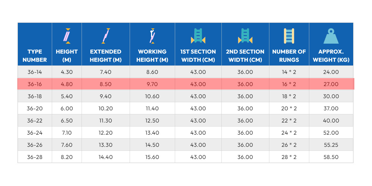 سلم الومنيوم ميتافورم طراز 36 وصلتين منزلقتين بحبل وهوك اتوماتيك (16 درجة مزدوج 4.80م – 32 درجة مفرد 8.50م ) METAFORM