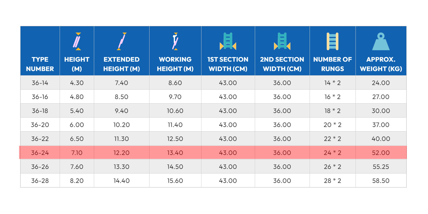 سلم الومنيوم ميتافورم طراز 36 وصلتين منزلقتين بحبل وهوك اتوماتيك (24 درجة مزدوج 7.10م – 48 درجة مفرد 12.20م ) METAFORM