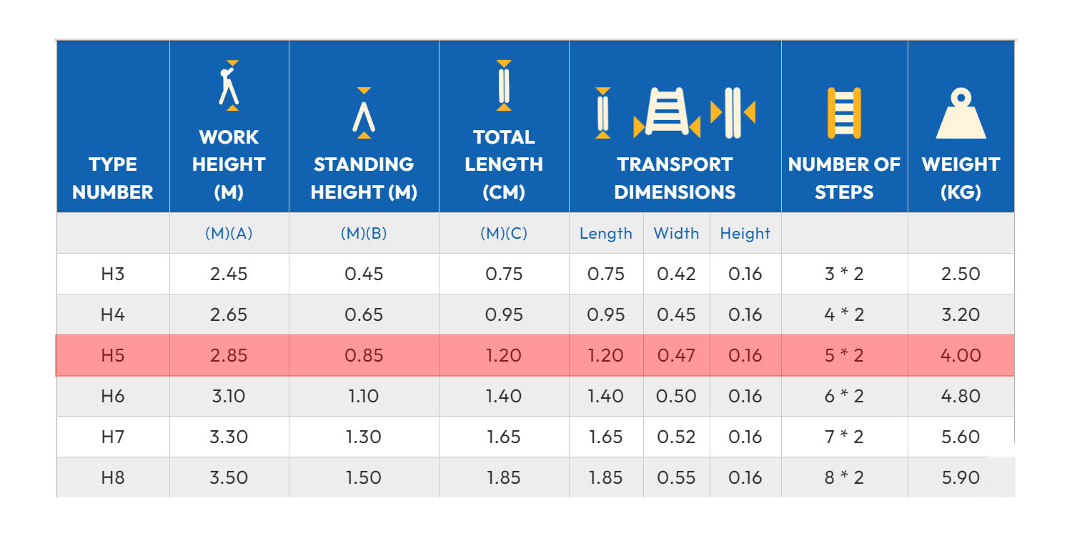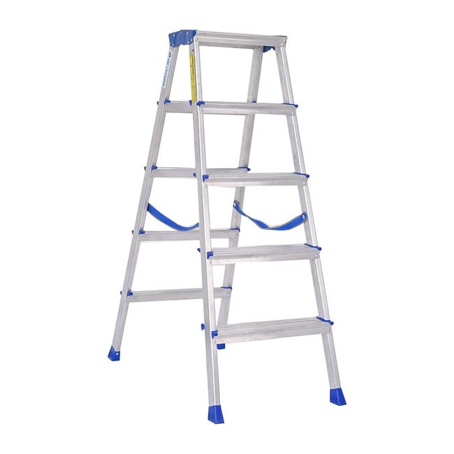 - سلم ذاتي الدعم بدرجات من الجانبين. سلم بدرجات قابلة للصعود عليها على الجانبين. خفيف الوزن وموثوق من أجل مهام الصيانة والاستخدام المنزلي. يتميز بدرجات قابلة للطي ومصنوعة من الألومنيوم على الجانبين بمنصة وقوف يبلغ مقاسها 200×350 ملم، ويتضمن مفصلات متينة من الصلب مطلية بطلاء كهربائي ساكن، وشريطان أمان بقوة شدّ عالية من أجل تثبيت السلم أثناء فتحه. كل درجة مثبتة على 4 جوانب ومؤمنة باستخدام 4 مسامير برشام ألومنيوم. الدرجات مصممة بعمق 80 ملم من أجل صعود آمن وموطئ قدم مريح. يتميز بأقدام مطاطية مضادة للانزلاق والصدأ.
