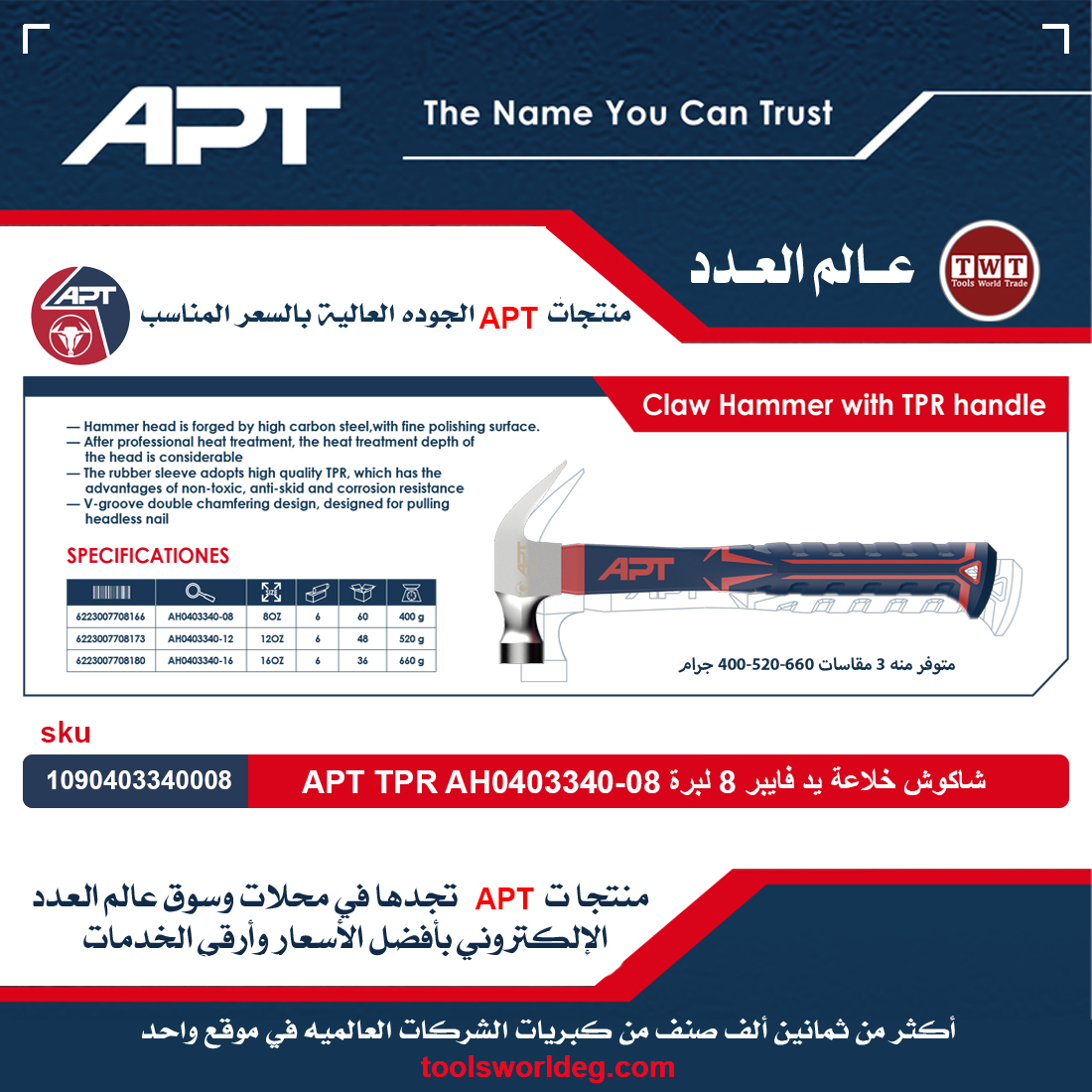 الوسوم: APT, HAMMER, TOOLS WORLD, ادوات يدويه, العدد, اي بي تي, شاكوش, شاكوش خلاعة يد فايبر, شاكوش خلاعة يد فايبر 16 لبرة, شاكوش خلاعة يد فايبر 16 لبرة APT TPR AH0403340-16, شواكيش, عالم العدد, مطارق