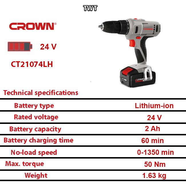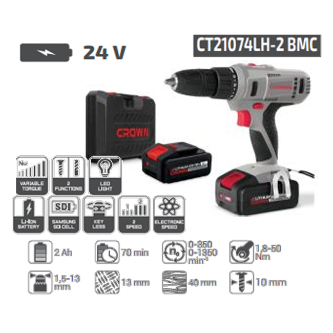 شنيور فك وربط بطاريه كراون 24 فولت 2 امبير 13 مم 50 نيوتن شنطة بلاستيك موديل CROWN – CT21074LH
