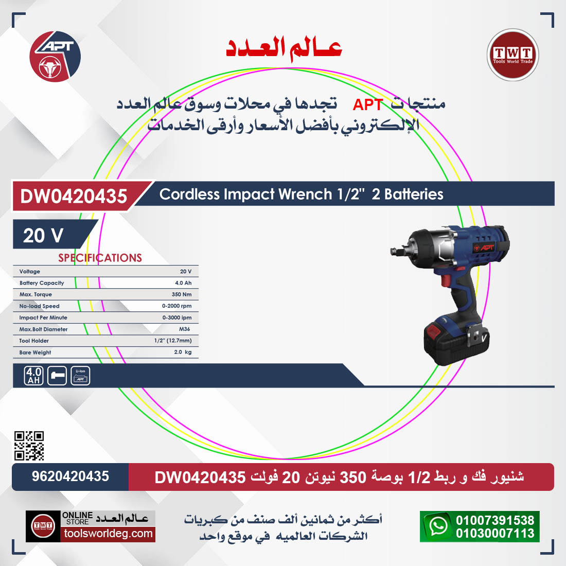 الوسوم: 350 نيوتن 20 ف2×4 APT - DW0420435, 9620420435, APT, drill, بوصه, حل و ربط, دريل, دريل نص بوصة, دريل نصف بوصة, شنيور APT, شنيور اي بي تي, شنيور بطارية, شنيور بطاريه, شنيور صيني, شنيور فك, شنيور فك و ربط 1/2 بوصة, شنيور فك و ربط اي بي تي 1/2 بوصة 350 نيوتن 20 فولت 2×4 امبير موديل APT DW0420435, شنيور فك وربط, شنيور مفك صيني, شنيور نص بوصه, عالم العدد, عدد, عدد كهربائية, معدات كهربائية