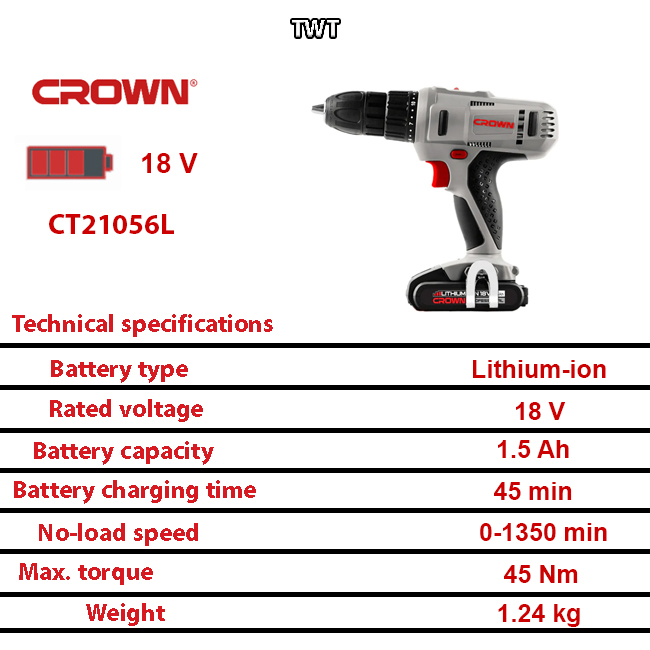 شنيور كراون 13 مم 45 نيوتن 1.5 امبير 2 بطارية 18 فولت ليثيوم ايون شنطة بلاستيك موديل CROWN CT21056L