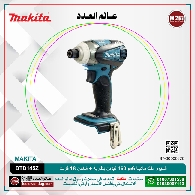 شنيور مفك بطارية ماكيتا 18 فولت 160 نيوتن 6 مم بطارية + شاحن موديل MAKITA DTD145Z
