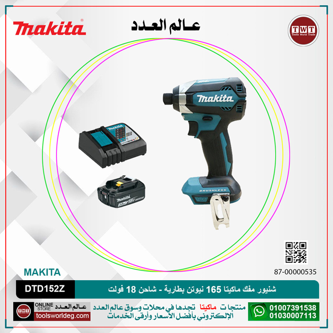 شنيور مفك بطارية ماكيتا 18 فولت 165 نيوتن بطارية + شاحن موديل – MAKITA DTD152Z