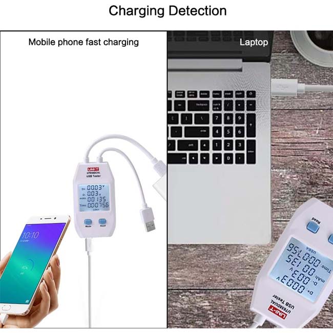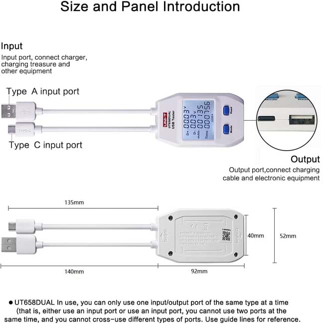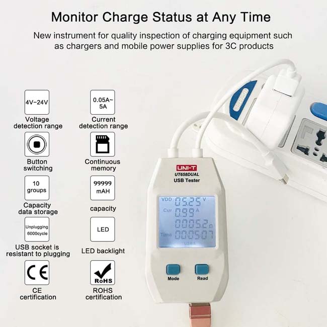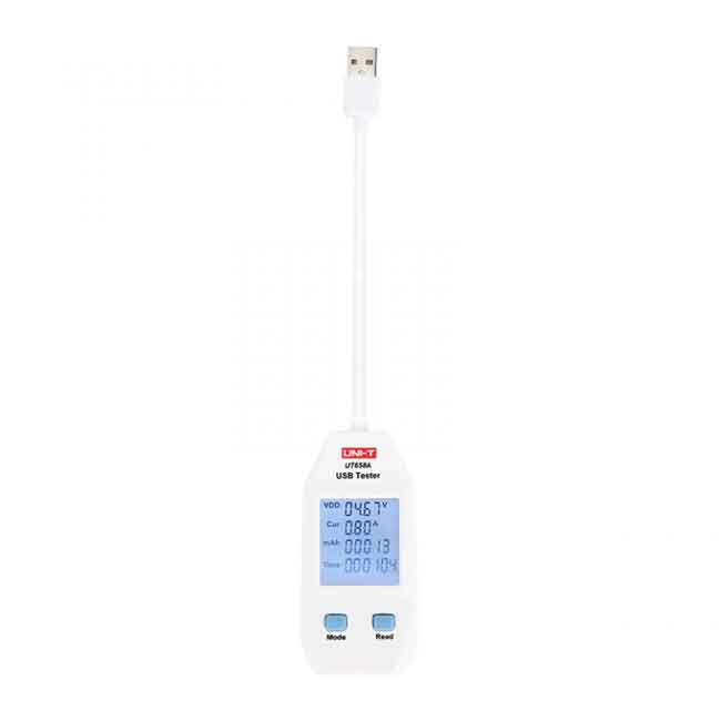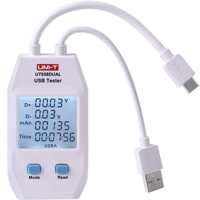 طراز من سلسلة UT658 وهو اختبار USB يدعم منافذ USB-A و USB-C في نفس الجهاز، بحيث يمكنك فحص شواحن وأجهزة وكابلات من النوعين.