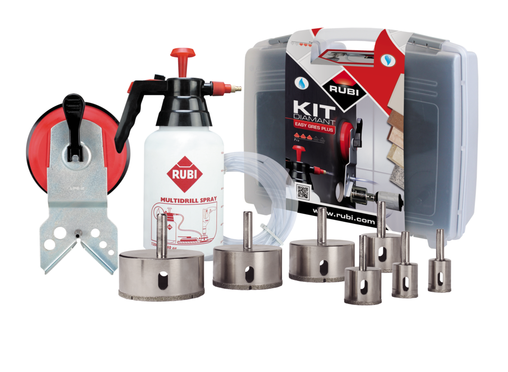 تسمح جودة الماس المستخدم في تصميم وتصنيع لقم الثقب EASYGRES بحفر الخزف الحجري والبورسلين والجرانيت والرخام والزجاج يتيح لك دليل EASYGRES عمل ثقوب في كل من الأرض والجدار وذلك بفضل التصميم الوظيفي لخزان المياه الذي يحتوي على صمام التحكم في التدفق. يمكن تثبيت الدليل بسهولة على أي سطح ، وذلك بفضل نظامه اللاصق المتجدد , بالإضافة إلى هذه المجموعات العملية تقدم RUBI أيضًا مجموعة EASYGRES PLUS التي تتكون من: 7 لقم حفر EASYGRES ( قطر 20 ، 28 ، 35 ، 43 ، 50 ، 68 و 75 مم ) قادره على قص حوالي 10 ثقوب في بلاط البورسلين ، دليل توسيط MULTIDRILL وخزان ووحدة خرطوم و حقيبة عملية