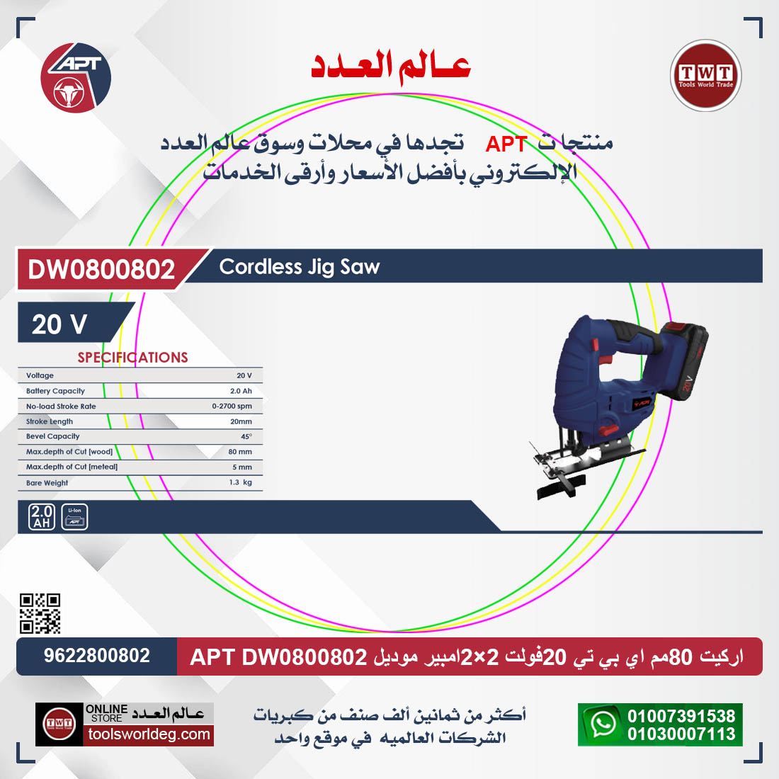 جهاز APT DW0800802 هو منشار أركت لاسلكي يعمل ببطارية 20 فولت، مصمم لتوفير أداء قطع دقيق ومرن في مجموعة متنوعة من المواد مثل الخشب، البلاستيك، والمعادن الخفيفة.