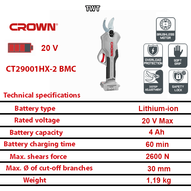 إليك شرح مُفصَّل لجهاز «مقص فروع شجر لاسلكي» من ماركة CROWN – موديل CT29001HX‑2 BMC، بجهد 20 فولت، مع بطاريتين 2 أمبير + شاحن + شنطة بلاستيك (كيت كامل).