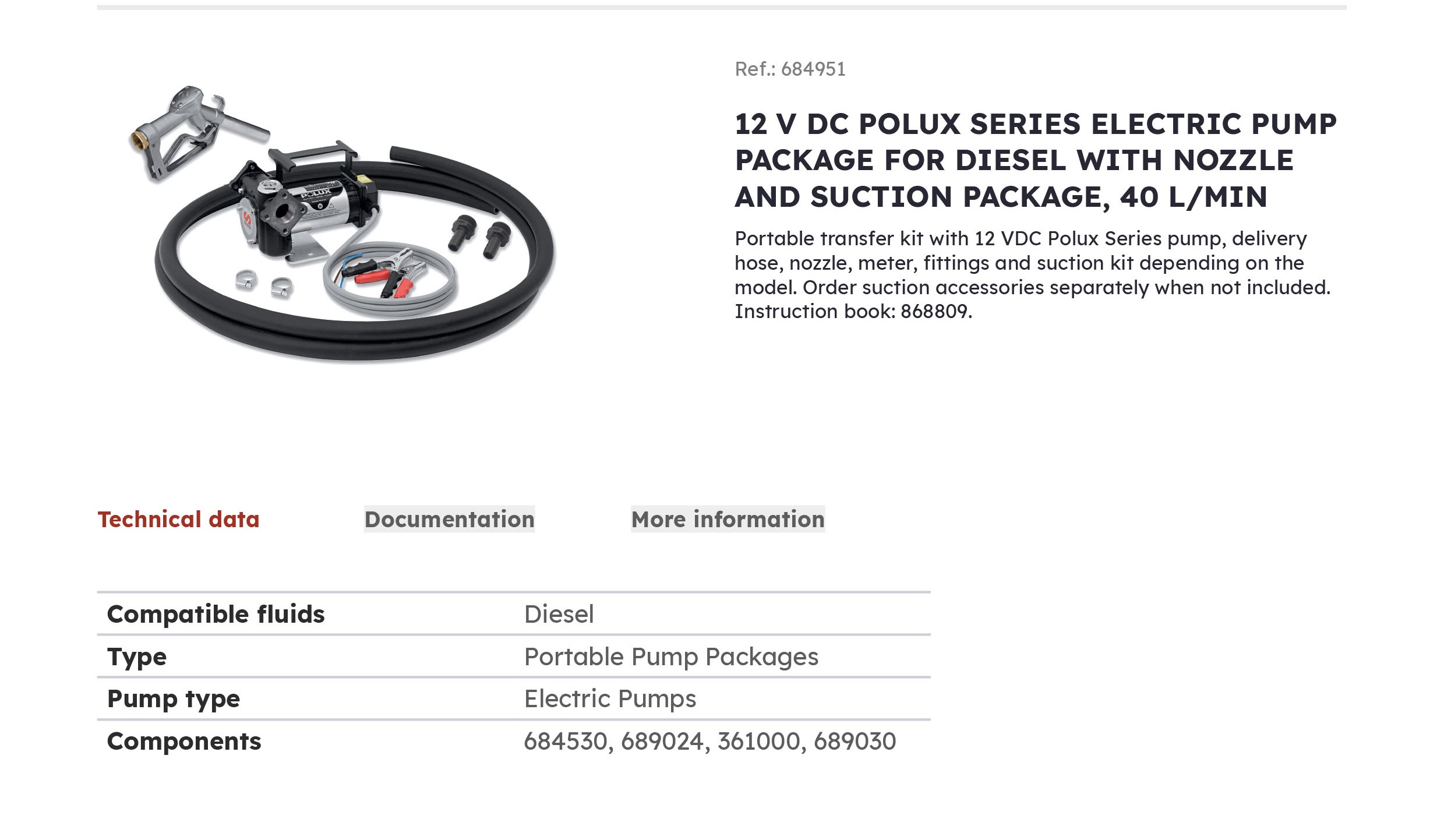 12 V DC POLUX SERIES ELECTRIC PUMP PACKAGE FOR DIESEL WITH NOZZLE AND SUCTION PACKAGE, 40 L/MIN