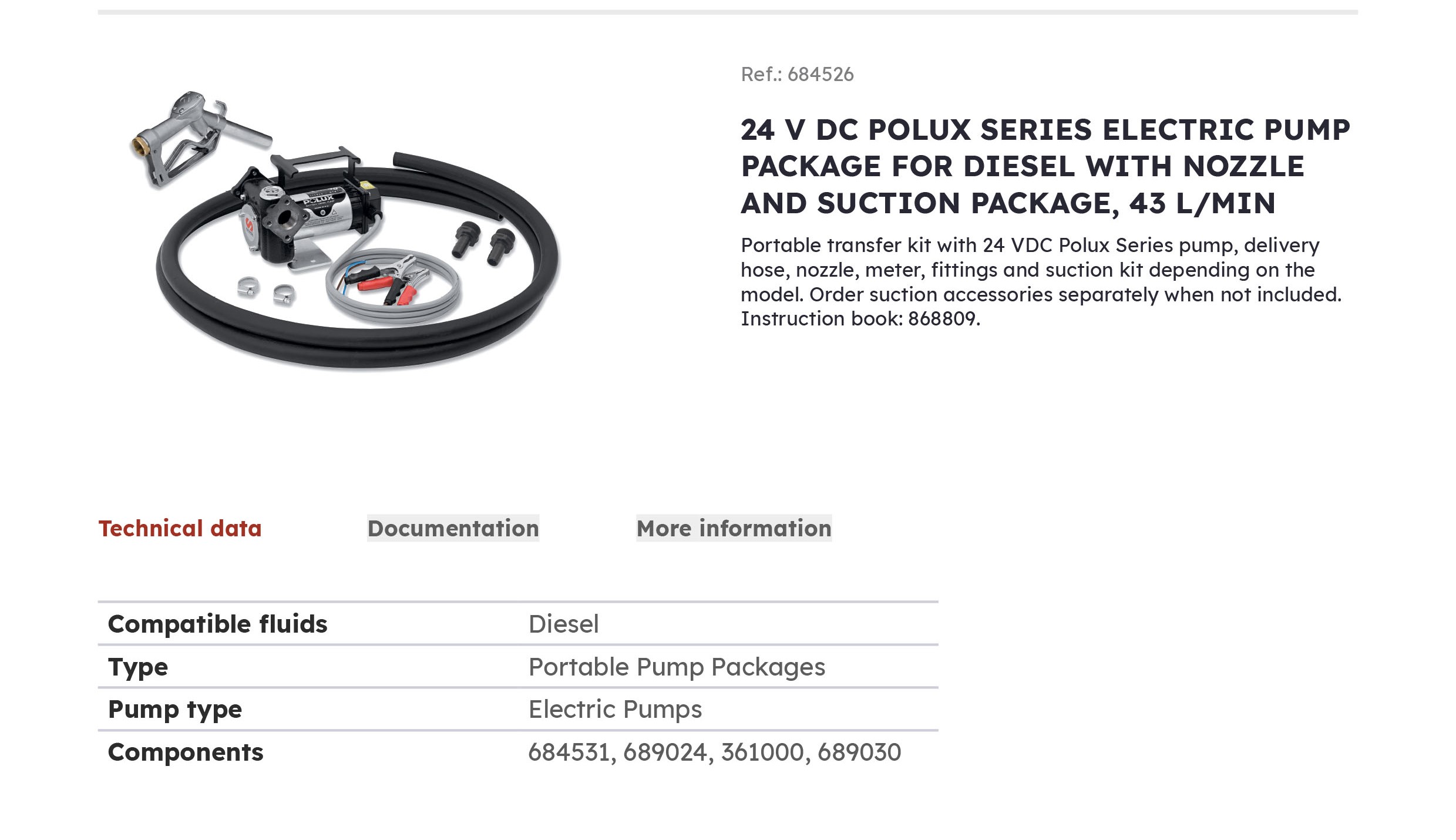 24 V DC POLUX SERIES ELECTRIC PUMP PACKAGE FOR DIESEL WITH NOZZLE AND SUCTION PACKAGE, 43 L/MIN
