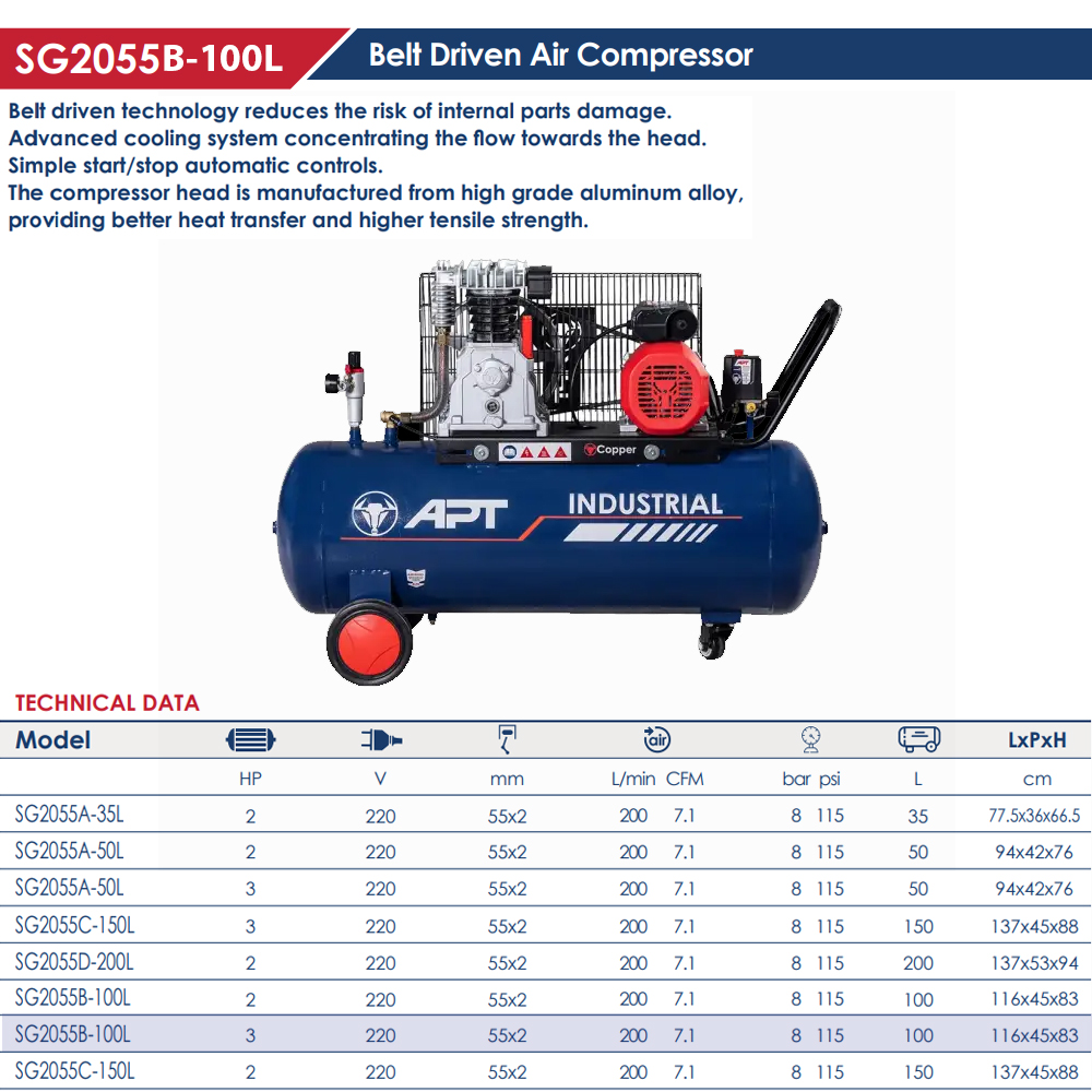 كمبروسر اي بي تي سعة 100 لتر 3 حصان سير صينى 220 فولت موديل APT – SG2055B-100L-3HP
