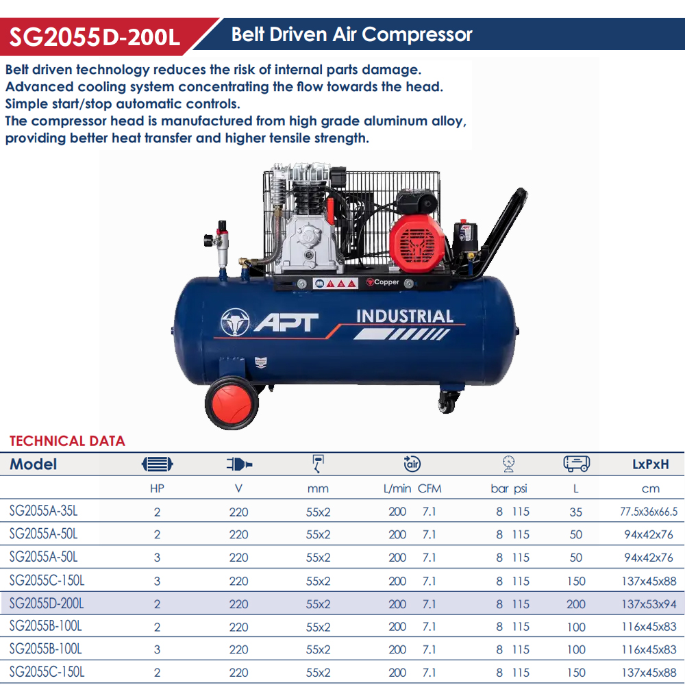 كمبروسر اي بي تي سعة 200 لتر 2 حصان سير صينى 220 فولت موديل APT – SG2055D-200L-2HP