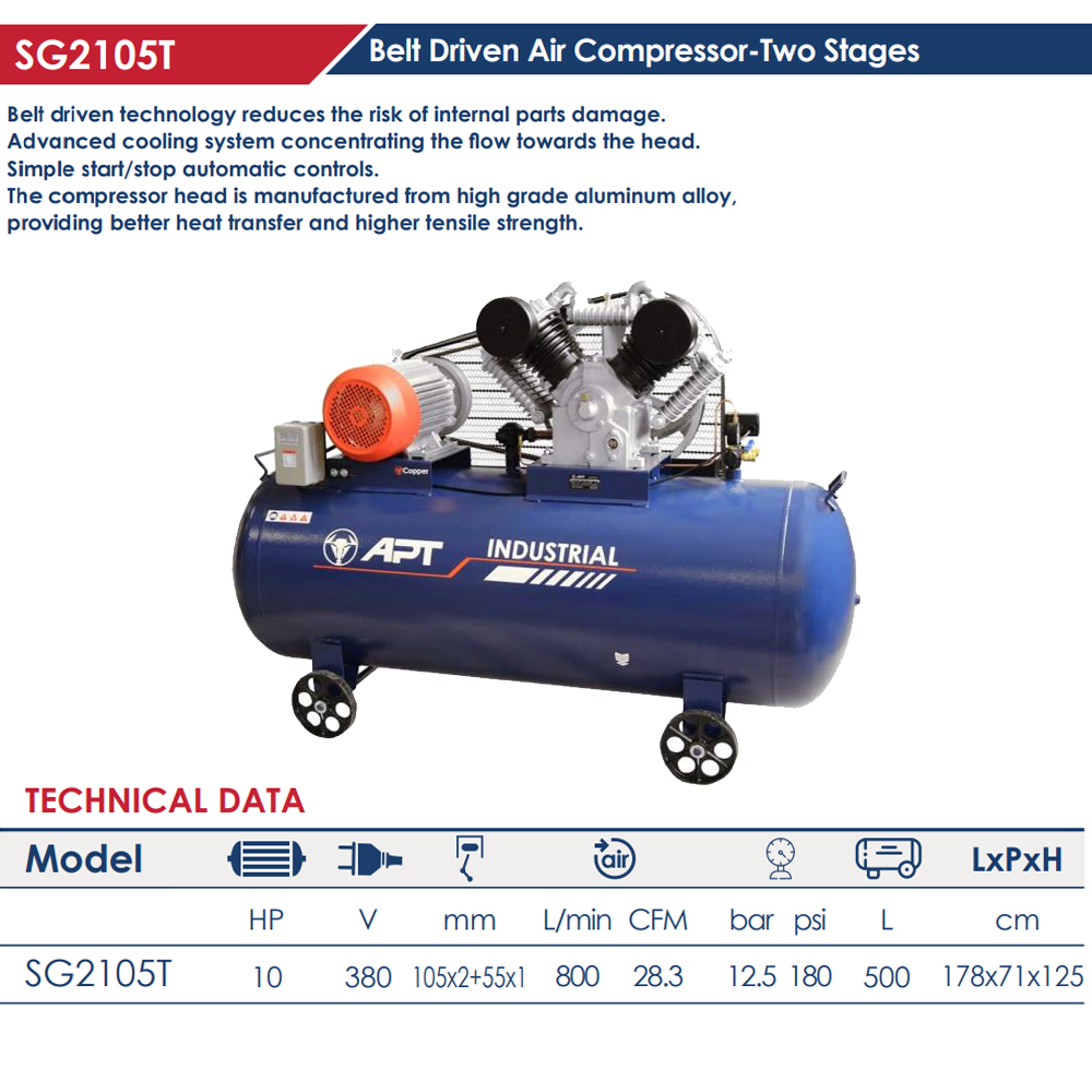 كمبروسر اي بي تي -APT سعة 500 لتر 10 حصان سير12.5 بار موديل SG2105T 500L