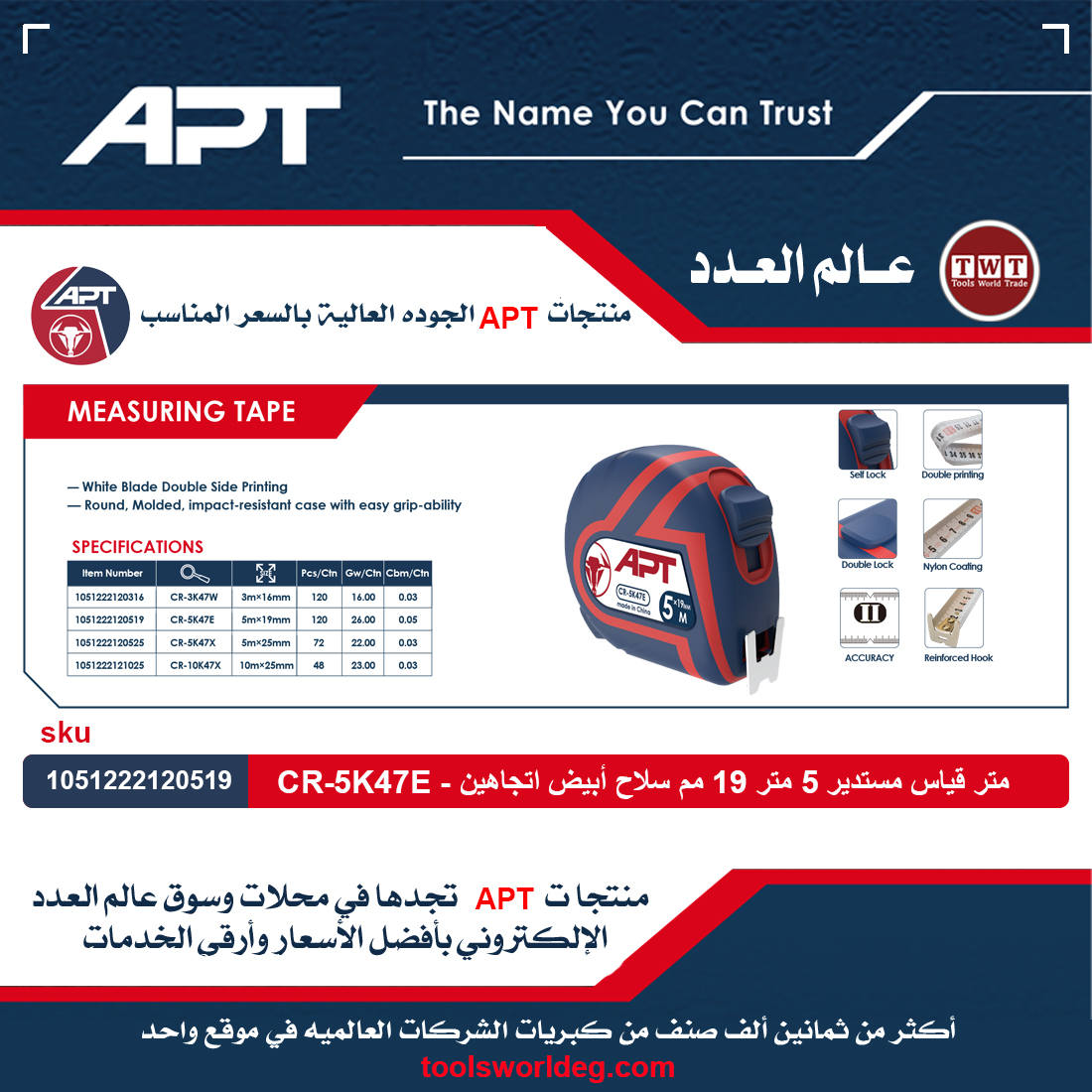 شريط قياس مستدير 5 متر 19 مم سلاح أبيض اتجاهين اي بي تي – موديل APT CR-5K47E