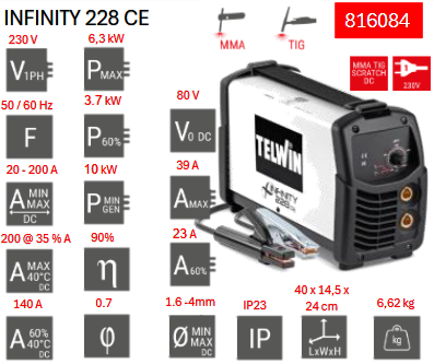 ماكينة لحام تيلوين انفرتر 200 أمبير أستنلس/ألومينيوم ايطالى TELWIN INFINITY 228-MMA