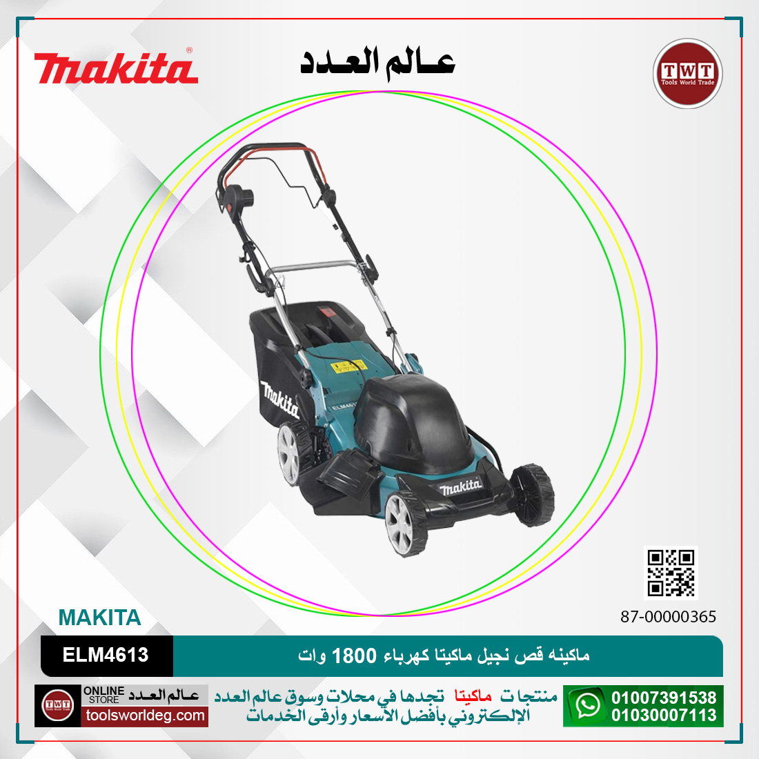 ماكينه قص نجيل ماكيتا كهرباء 1800 وات عرض 46 سم سعه 60 لتر ارتفاع القص 20-75 مم 32.5 كجم موديل – MAKITA ELM4613