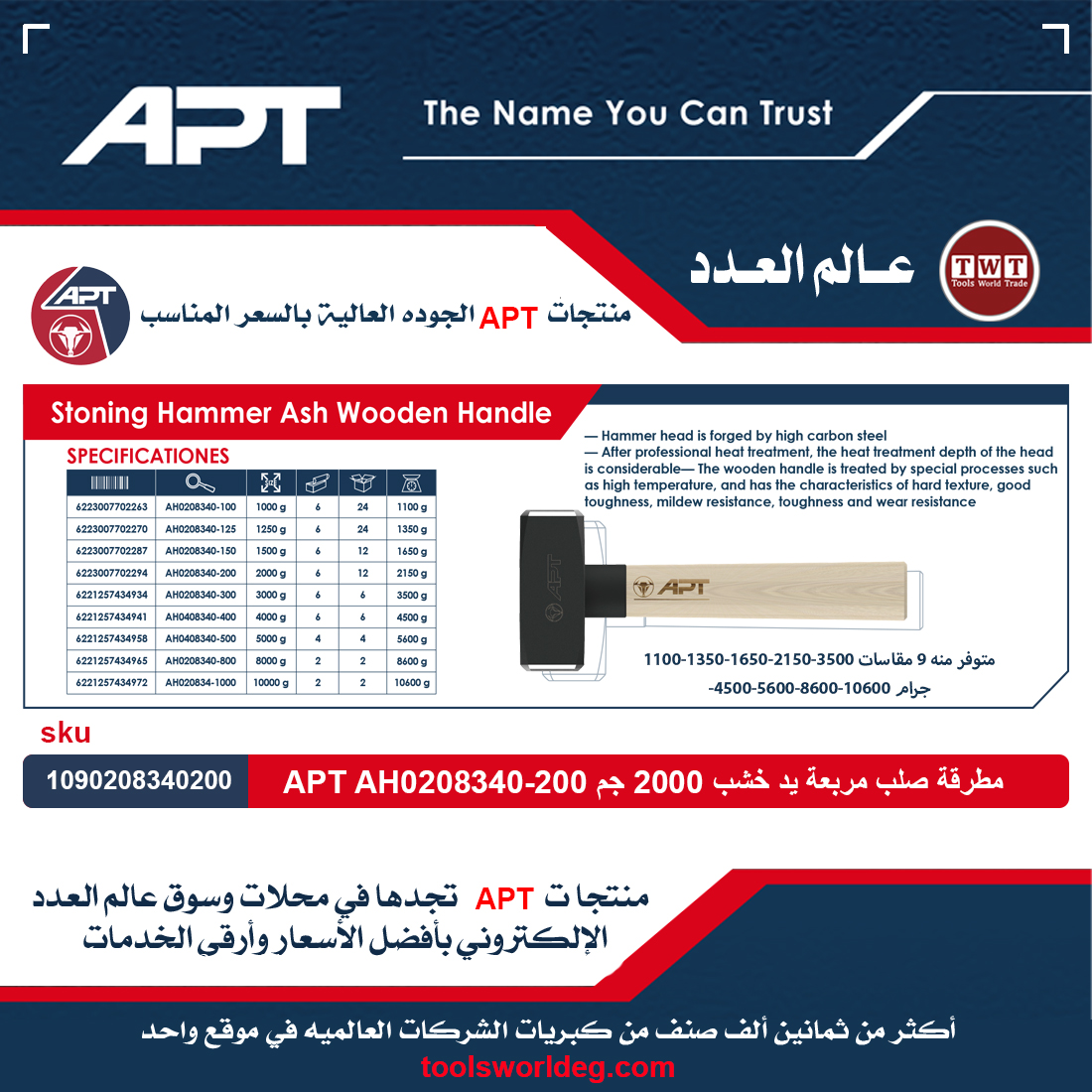 مطرقة صلب مربعة يد خشب 2000 جرام اي بي تي موديل APT AH0208340-200