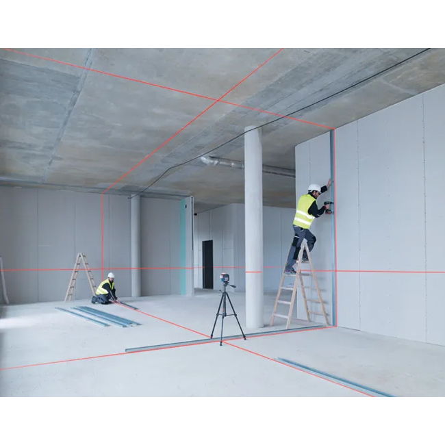 يطلق 3 خطوط بزاوية 360°: أحدها أفقي (حول الغرفة بالكامل) + خطّان رأسيّان متعاكسان. هذا يسمح بتسوية أفقية ورأسية في نفس الوقت. -