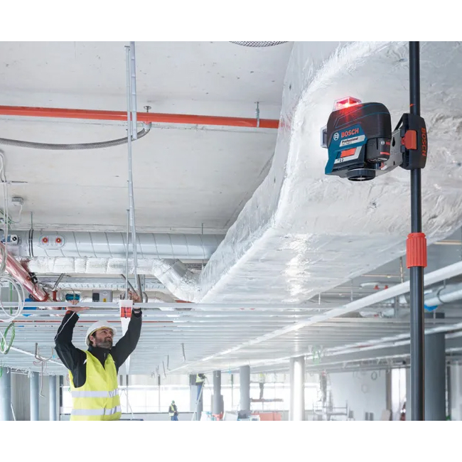 عند استخدام كاشف ليزر مناسب (مثلاً LR 6 أو LR 7 من بوش)، يمكن أن يمتد المدى حتى 120 متر. -