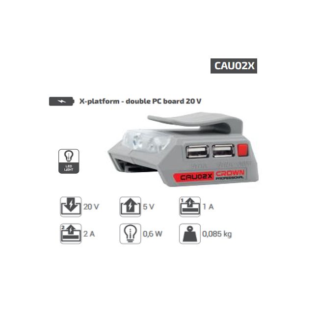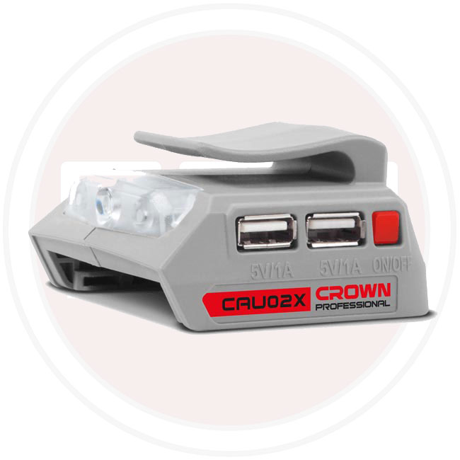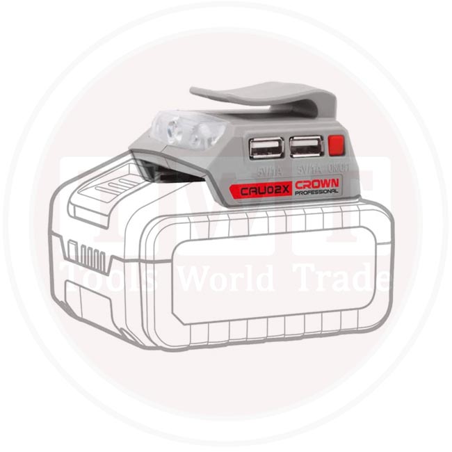 يُعدّ حلّاً عمليّاً لشحن الموبايلات أو الأجهزة الصغيرة عبر مخرجين USB، باستخدام طاقة مأخوذة من بطارية CROWN 20 V بدلاً من فولتية الكهرباء المنزلية التقليدية.